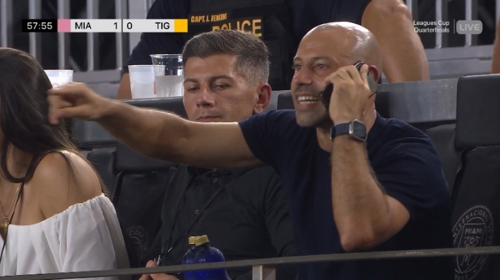 8月21日联盟杯四分之一决赛中,迈阿密国际对阵老虎大学。下半场期间,主帅马斯切拉诺因抗议裁判判罚被红牌罚上看台,随后通过电话远程指挥球队作战。