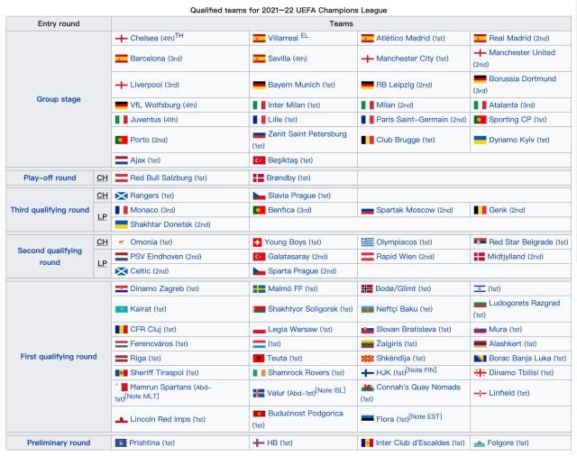 注:资格赛附加赛的6支出线队,将按欧战积分多寡被分入第三或第四档。皇马、巴萨和尤文因为拒绝退出欧超,有可能遭到欧足联禁赛,若三队无缘参赛,后面的球队将递补进入二档。